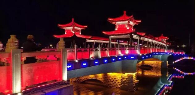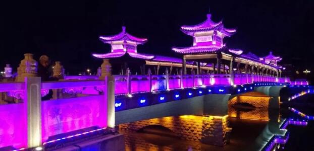 太平橋用隱藏式的瓦楞投光燈照亮建筑屋面,變幻四季顏色,絢麗多彩,形成一定的韻律感,河中倒影給人波光粼粼的勝境,整體氣勢(shì)恢弘,在橋的欄桿下一側(cè)用定制的祥云圖案燈順序排列,寓意祥和、太平,突出太平盛世文化。